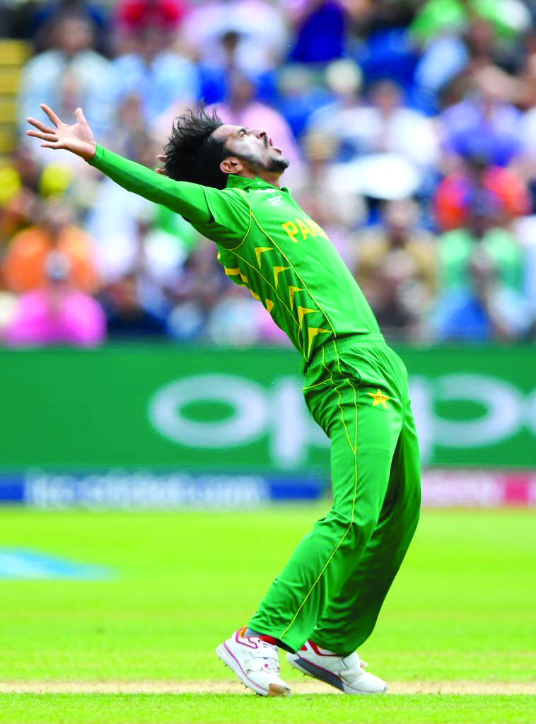CARDIFF, WALES – JUNE 14: Pakistan bowler Hasan Ali celebrates after dismissing England batsman Eoin Morgan during the ICC Champions Trophy semi final between England and Pakistan at SWALEC Stadium on June 14, 2017 in Cardiff, Wales. (Photo by Stu Forster/Getty Images)