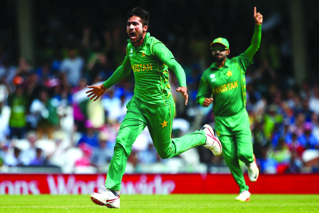 LONDON, ENGLAND – JUNE 18: Mohammad Amir of Pakistan celebrates after taking the wicket of India’s Shikhar Dhawan during the ICC Champions Trophy Final match between India and Pakistan at The Kia Oval on June 18, 2017 in London, England. (Photo by Charlie Crowhurst/Getty Images)