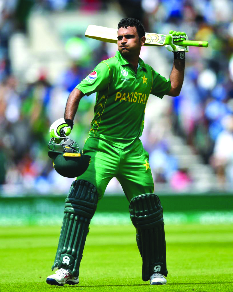 LONDON, ENGLAND – JUNE 18: Fakhar Zaman of Pakistan celebrates reaching his century during the ICC Champions Trophy Final between India and Pakistan at The Kia Oval on June 18, 2017 in London, England. (Photo by Gareth Copley/Getty Images)