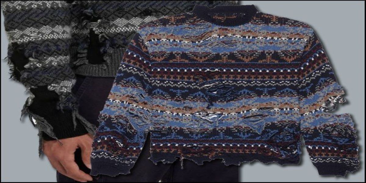 Looking at these sweaters made by a company called “Balenciaga”, it looks as if they are very old, they have been cut by rats from place to place and the wool has been torn from place to place.