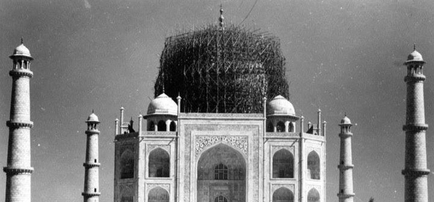 In 1942, during the 2nd World War, the British thought that the Taj Mahal was vulnerable to bombing by the German Luftwaffe bombers (and also the Japanese) and placed bamboo scaffolding over the Taj Mahal. While the images here only show the dome of the Taj Mahal covered with a thick layering of bamboo scaffolds, it is widely believed that the whole Taj Mahal was layered. The same thing was done when India was fighting a war against Pakistan in 1965 and 1971.