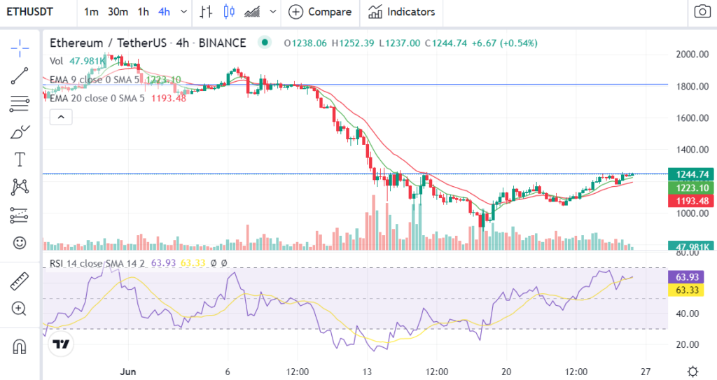 At the time of writing, the price of ETH has risen slightly more than 1% in the previous 24 hours to $1,242.47. This is in addition to its stellar performance on the weekly chart, where its price has increased by nearly 26.29 percent in the last seven days.ETH has also increased in value relative to BTC by 1.19 percent. At the moment, 1 ETH token is worth around 0.05807 BTC.