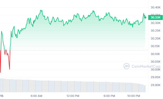 The current price of Bitcoin is $30,335.63 USD, and the 24-hour trading volume is $11,286,761,715 USD. We provide real-time updates for the BTC to USD price. Over the past 24 hours, Bitcoin has experienced a 0.44% increase. It holds the top position on CoinMarketCap with a live market cap of $589,661,473,361 USD. The circulating supply consists of 19,430,137 BTC coins, with a maximum supply of 21,000,000 BTC coins.