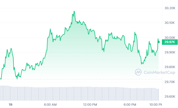 Today’s Bitcoin price stands at $29,974.61 USD, accompanied by a 24-hour trading volume of $13,903,948,758 USD. Our BTC to USD price is continuously updated in real-time. Over the past 24 hours, Bitcoin has seen a 0.43% increase. Currently ranked #1 on CoinMarketCap, its live market cap amounts to $581,193,530,308 USD. The circulating supply consists of 19,432,993 BTC coins, while the maximum supply is capped at 21,000,000 BTC coins.