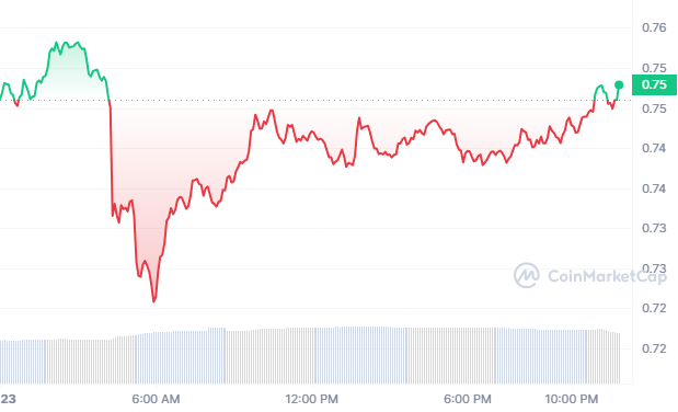 As of today, the real-time XRP price stands at $0.747516 USD, and its 24-hour trading volume is $1,731,853,631 USD. Over the last 24 hours, XRP has experienced a modest increase of 0.29%. It currently holds the #4 position on CoinMarketCap, boasting a live market cap of $39,277,540,736 USD. The circulating supply of XRP coins amounts to 52,544,091,958, while the maximum supply is capped at 100,000,000,000 XRP coins.