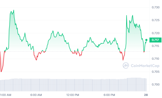 As of today, the current XRP price stands at approximately $0.716392 USD, and it has experienced a slight increase of 0.10% in the last 24 hours. The total trading volume during this period has reached $1,726,865,873 USD. XRP holds the #4 position on CoinMarketCap’s ranking, with a live market cap of approximately $37,749,476,751 USD. The circulating supply of XRP coins is 52,693,851,493, and the maximum supply is capped at 100,000,000,000 XRP coins. Please note that the XRP to USD price is updated in real-time.