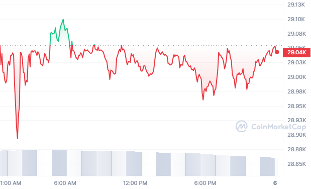 The live Bitcoin price today is $29,039.82 USD with a 24-hour trading volume of $7,600,371,224 USD. We update our BTC to USD price in real time. Bitcoin is down 0.18% in the last 24 hours. The current CoinMarketCap ranking is #1, with a live market cap of $569,610,800,266 USD. It has a circulating supply of 19,442,437 BTC coins and a max. supply of 21,000,000 BTC coins.