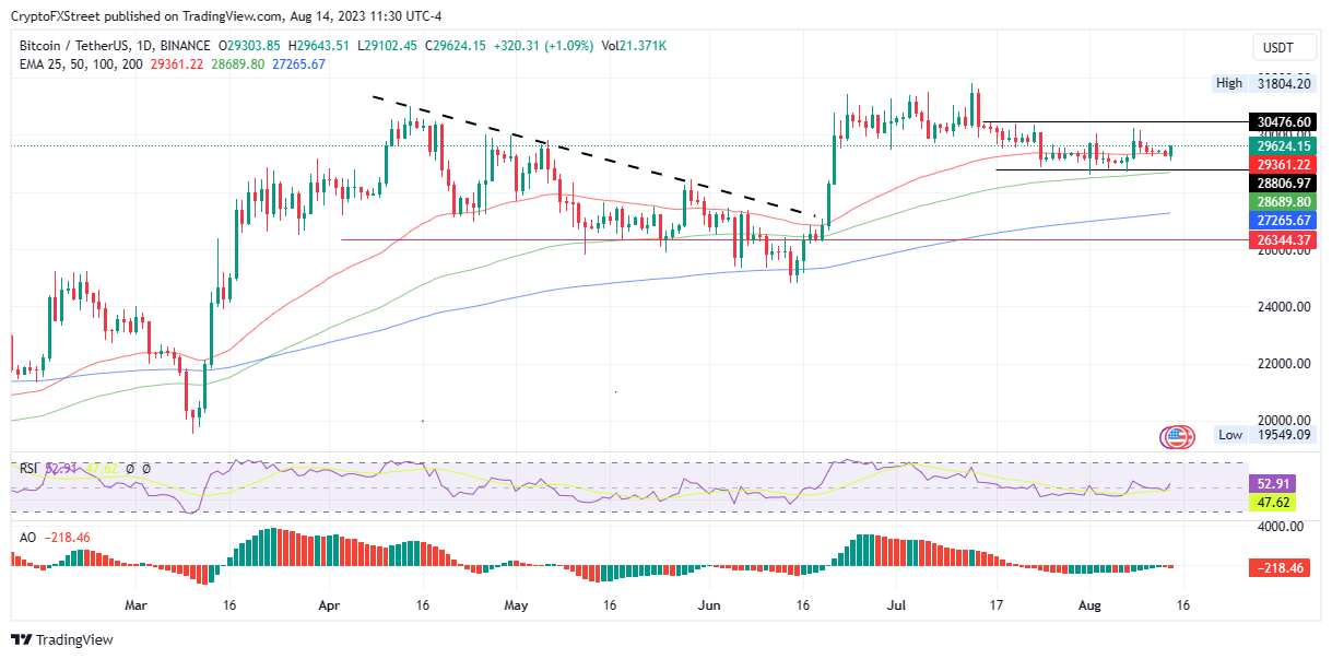 Rejection from the $30,476 level, on the other hand, may see Bitcoin price fall back below the 50-day EMA and down to break below the $28,806 support level before tagging the 100-day EMA at $28,690.
