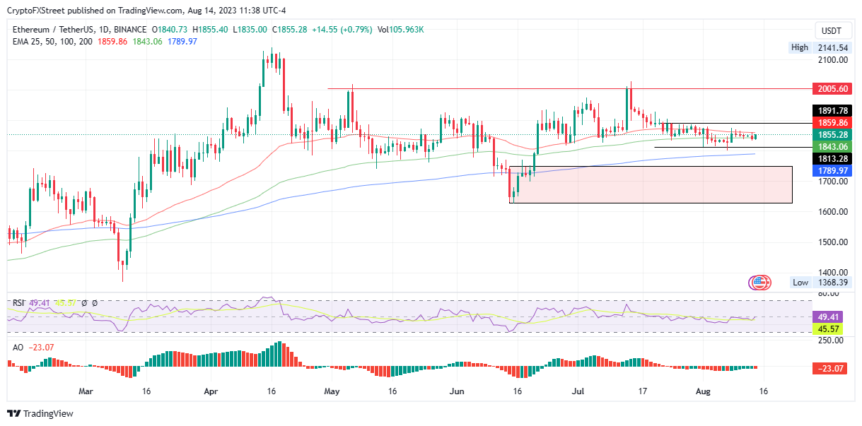 The price of Ethereum (ETH) is stuck between the 50-day and 100-day exponential moving averages (EMAs) of $1,859 and $1,843, respectively.
