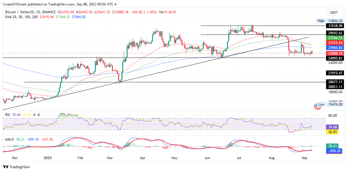 A bullish revival could provide such impetus for Bitcoin price, supporting an upward recovery. Such a rise might push BTC over the 200-, 50-, and finally 100-day Exponential Moving Averages (EMA) at $27,066, $27,414, and $27,763, before resuming above the ascending trendline support at $29,692.