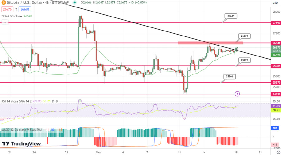 Bitcoin’s technical analysis indicates a mild bearish trend. Bitcoin is currently holding above the $26,800 resistance, slightly above the $26,500 support, signalling the possibility of a double-top pattern.