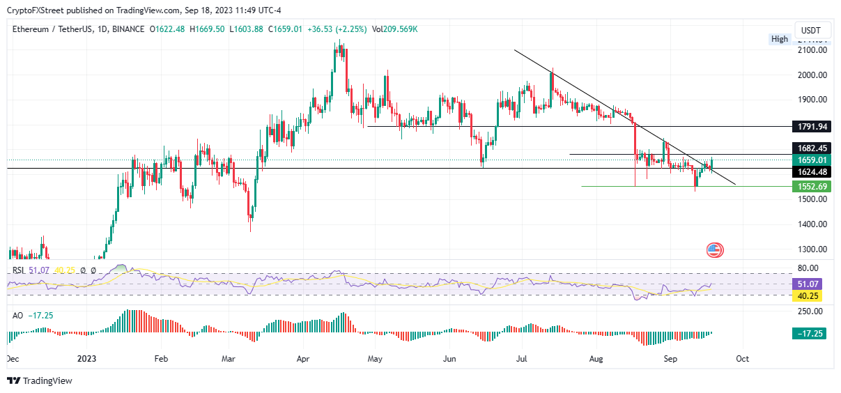 As a result of the momentum RSI and AO indicators showing a positive picture, ETH might break through the $1,682 mark and continue to rise.