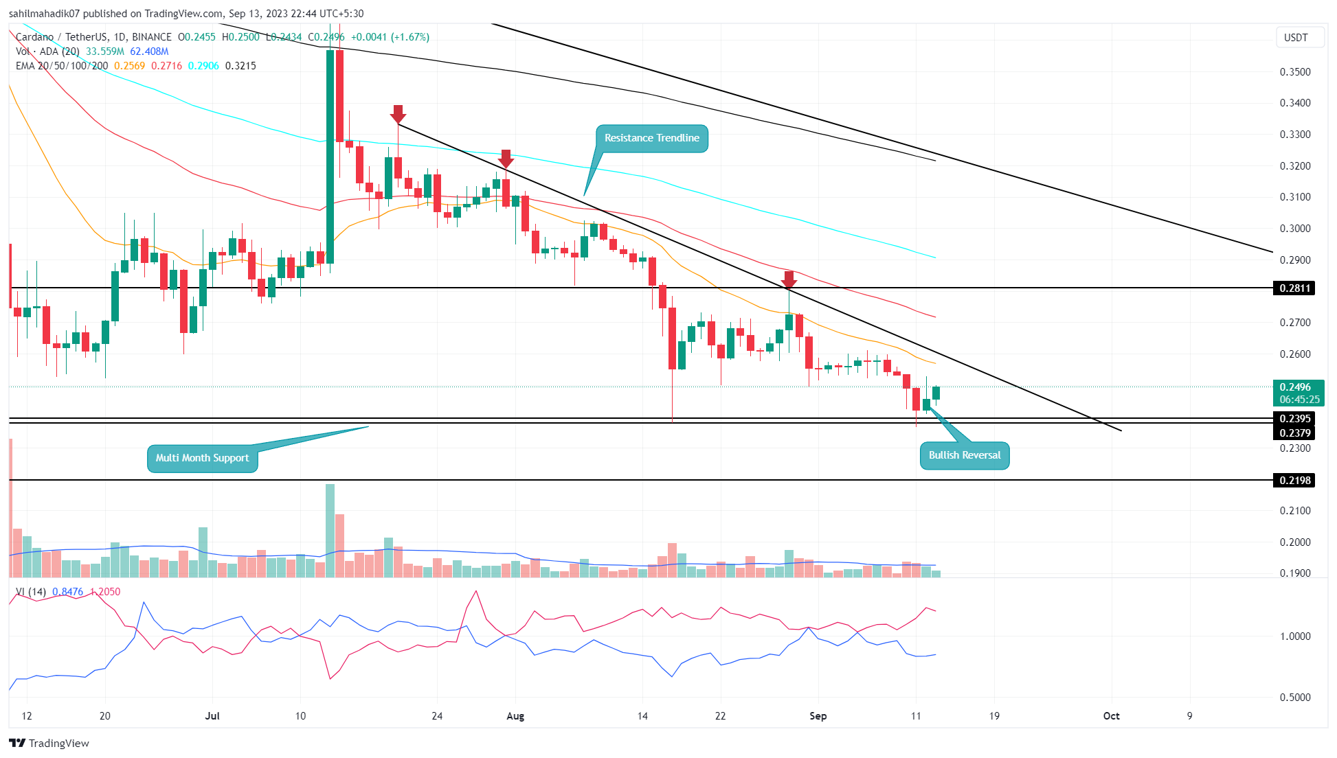 The ADA price is currently on a relief rally, boosted by increased demand pressure near the $0.24 support level. If the purchasing enthusiasm continues, the altcoin might gain another 3% this week, aiming for a key resistance that has restricted its gains for nearly two months.