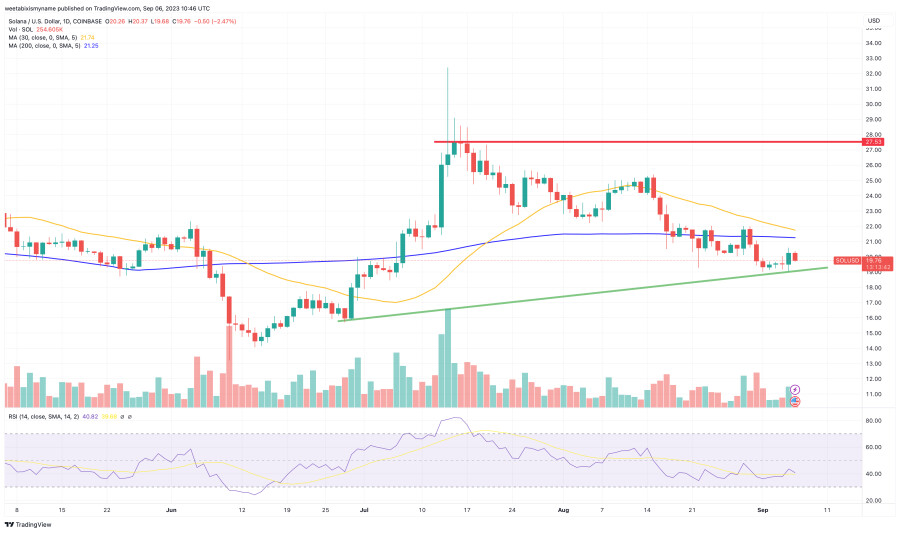 This viewpoint is confirmed by the fact that SOL’s support level (green) has risen in recent days, signalling that the coin is unlikely to fall lower in the near future.