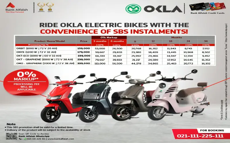 The ORBIT model, featuring a 1000W motor with a 72V 20AH battery, is priced at Rs159,000 and comes with a low processing fee of 2.5 percent. At the higher end, the OMO-GRAPHENE model, powered by a 2000W motor and a 72V 38AH battery, is available for Rs339,000 with a 5 percent processing fee.