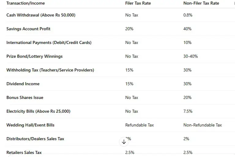 Non-filers in Pakistan will face higher withholding taxes across various sectors. Teachers and service providers who are non-filers will be taxed at 30%. For dividend income, non-filers will pay 30%, while filers will only pay 15%. Non-filers will also face a 20% tax on bonus shares and a 7.5% tax on electricity bills exceeding Rs 25,000 for residential users.