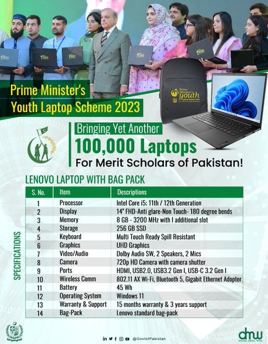 The Government of Pakistan has shared the specifications of the laptops offered under the PM Laptop Scheme 2023 in a tweet.