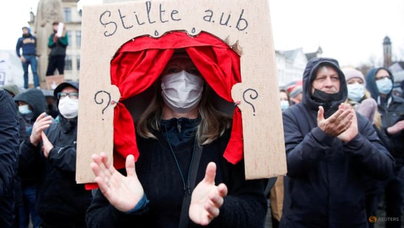 FILE PHOTO: A woman holds a banner reading “Silence please” during a demonstration against the Belgian government’s restrictions imposed to contain the spread of coronavirus disease (COVID-19) in Brussels, Belgium December 26, 2021. REUTERS/Johanna Geron/File Photo