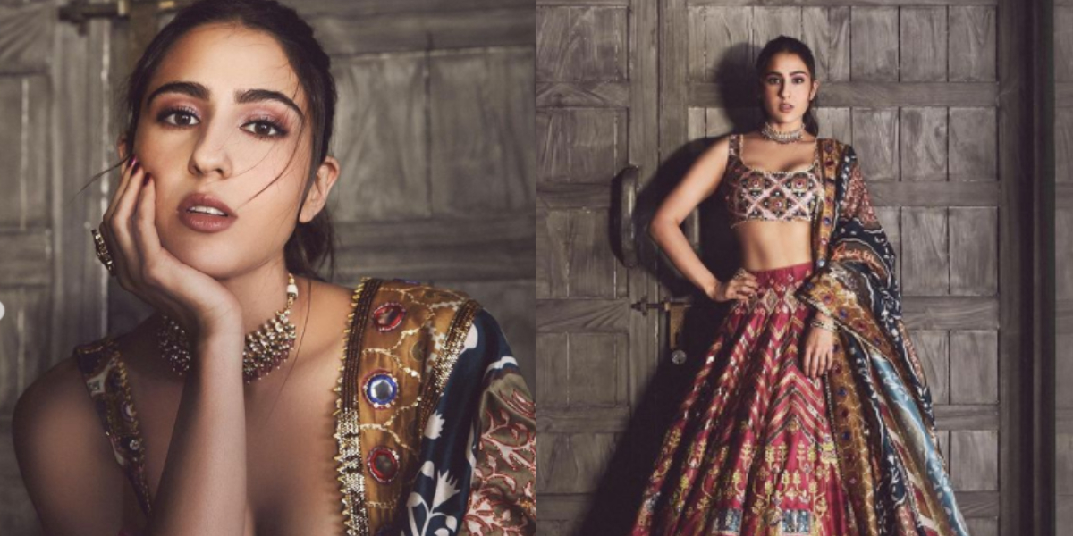 Turning to her Instagram pictures, the diva looked like the ultimate show-stopper in a red Mughal lehenga set that featured a strappy blouse with heavy embroidery and royal blue dupatta sequins with colorful printed details and broad borders. She accessorized her look with bangles, a choker, and rings. Sara’s matt-skin, smokey eyes with a little winged dramatic kajal sealed the outfit into an exquisite bride.