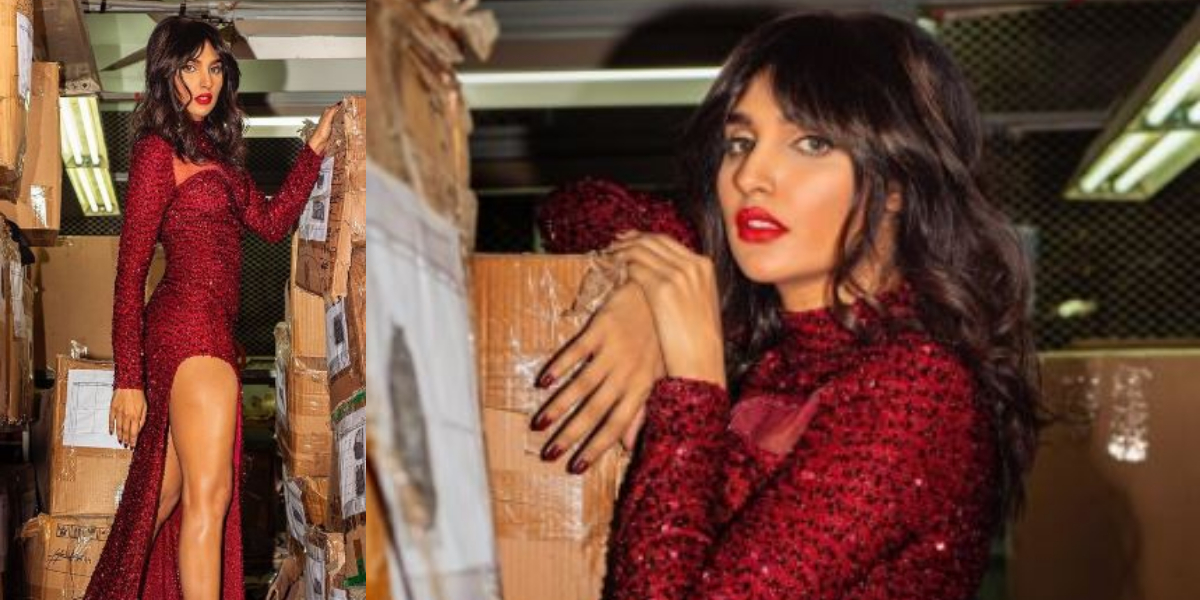 Taking to Instagram, the 7 Din Mohabbat In actress shared a series of pictures wearing a revealing sparkling maroon dress with a side slit, showing off her legs as she posed from all sides.