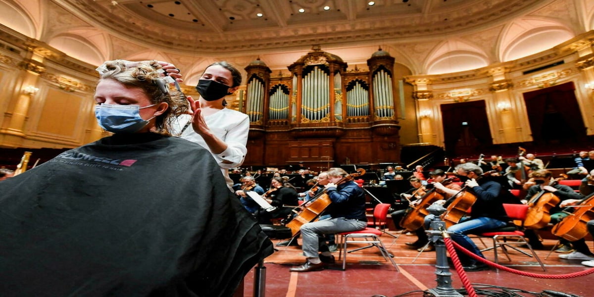Barbers clipped hair on stage during the “Hair salon at the Concertgebouw” event. While the orchestra played Charles Iver’s Symphony No. 2.