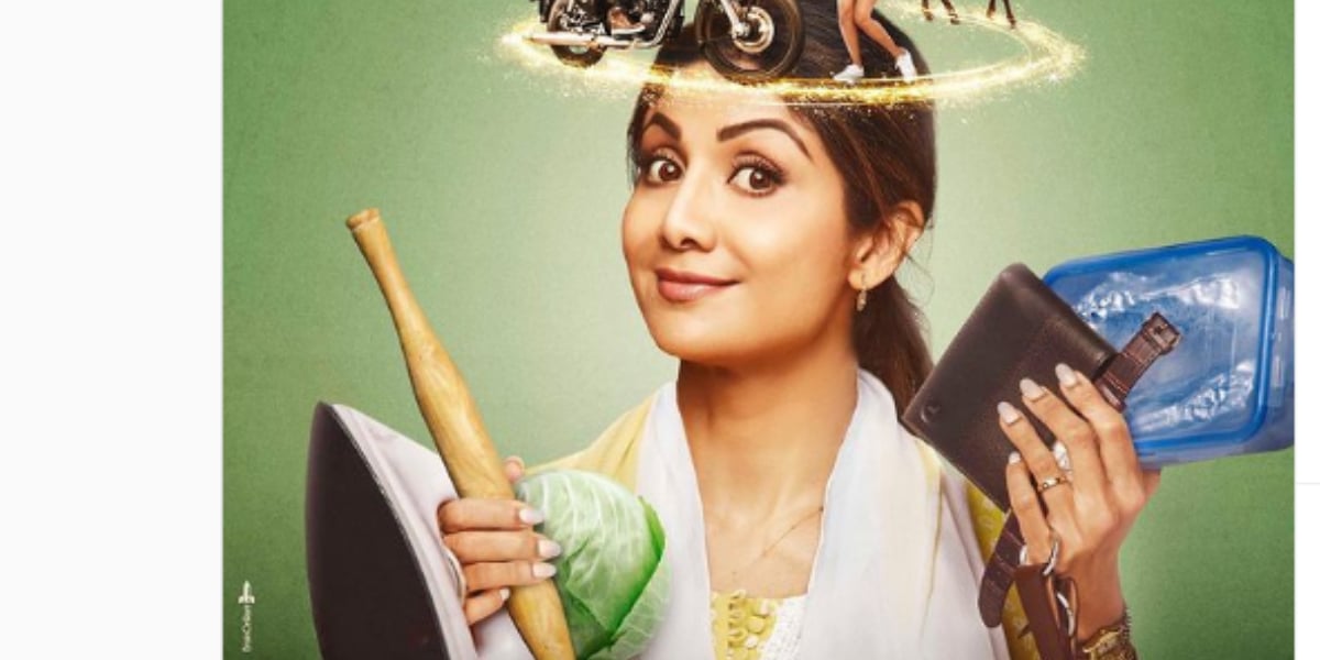 Shilpa is wearing a salwar suit and clutching many household items in her hands, including a rolling pin, an iron, a vegetable, a wallet, a watch, and a medication box, in the poster she uploaded.