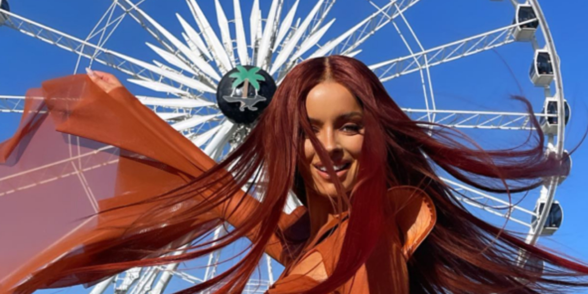 Maura, 31, wore a brown suit with long, winged sleeves and posed in front of the music festival’s famed Ferris wheel.