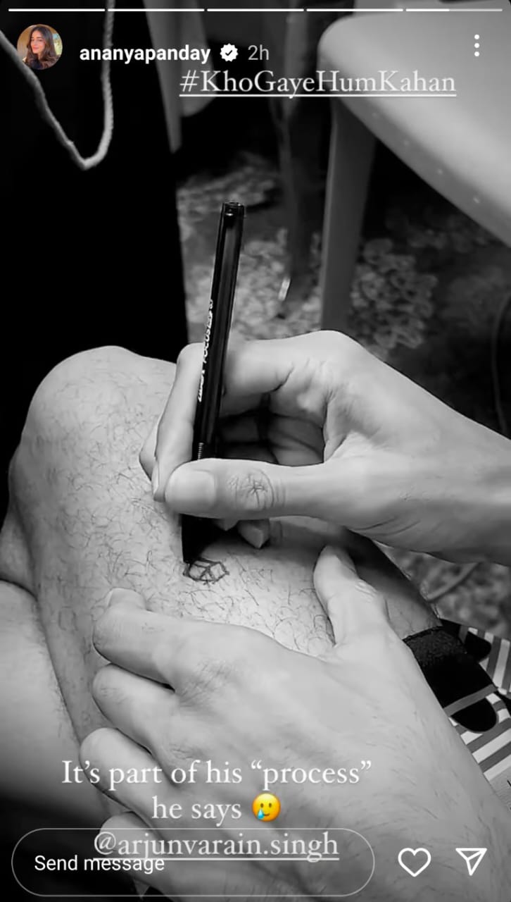 The actress shared a video from the set of her upcoming movie Kho Gaye Hum Kahan on Instagram’s stories feature. Ananya can be seen in the video filming her director Arjun as he draws a cube on his thigh. After displaying the scribble to her audience, Ananya switches the camera to reveal Arjun’s face. She shared the video and wrote, “It’s part of his “process,” he says (smiling and crying emoji) @arjunvarain.singh,” as the caption of the post. She also used the hashtag “# KhoGayeHumKahan.”