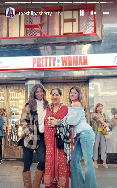 Speaking of which, the Dhadkan actress recently shared a few glimpses of her trip to see the musical “Pretty Woman” with her mother and sister on her Instagram stories. Before the start of the show, Shilpa could be seen chilling with her mother and sister in the first selfie video. The actress captioned the photo, “Pretty Woman with My Pretty Women… # musical # londondiaries,” she wrote. Shilpa, Shamita, and their mother are all pictured posing together in the diva’s photo.