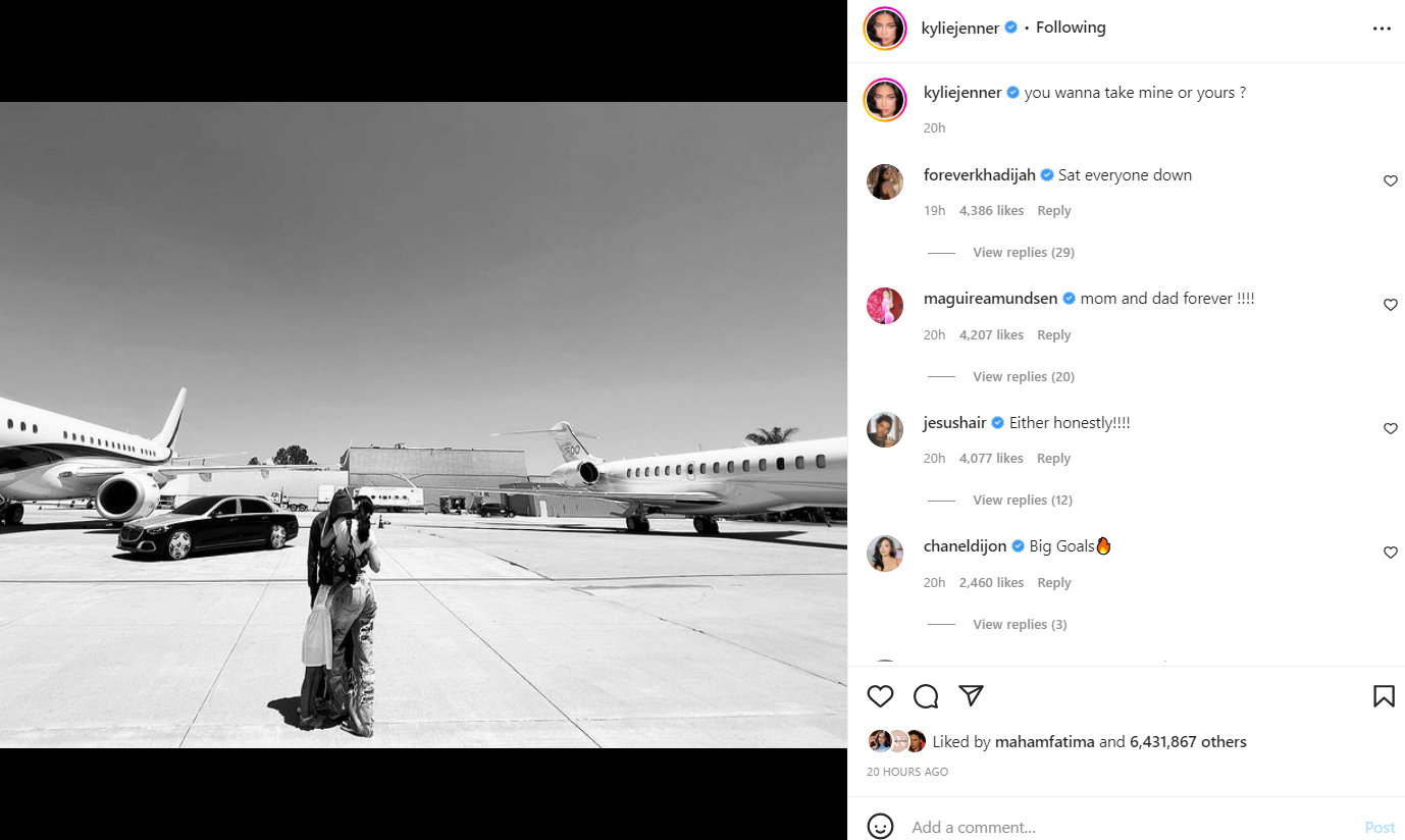 Kylie Jenner has left some of her Instagram followers unimpressed with her latest post as she shared a black and white snap showing off two private jets.