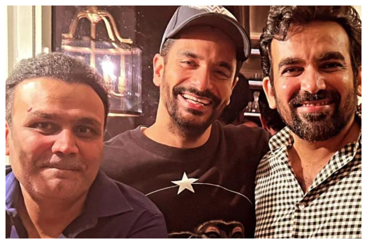 Angad Bedi poses with former cricket players Virender Sehwag and Zaheer Khan