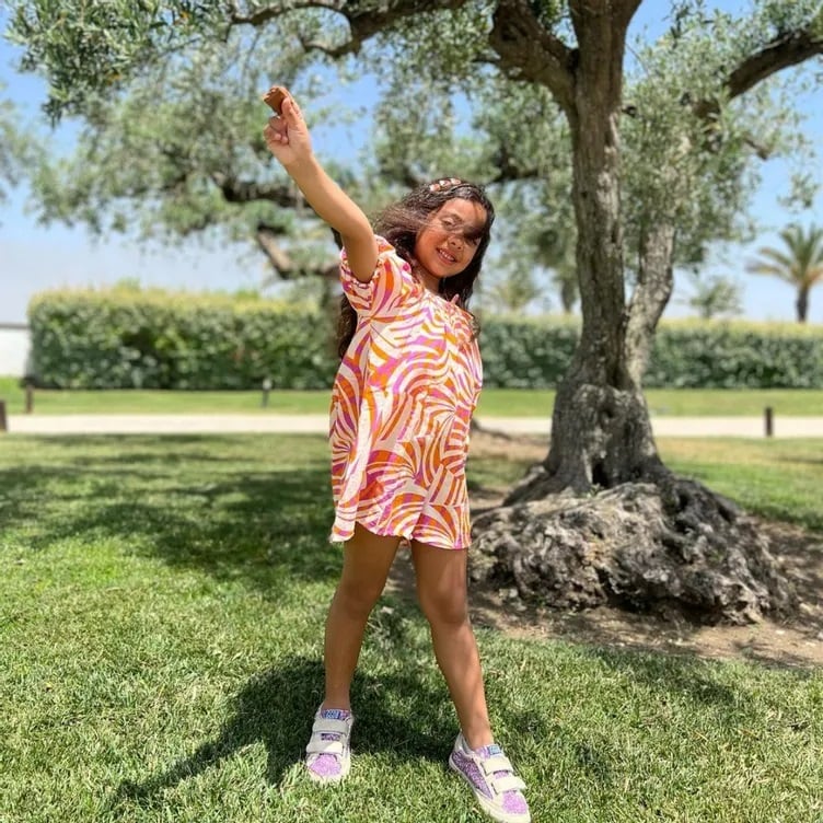 The young mother captioned the shot, “My darling child, you’re our sunshine!” Shine bright, sweet 6! I’m happy to be your mama since you have a pure heart. “Love you!” Misha wears a striped minidress and white shoes.