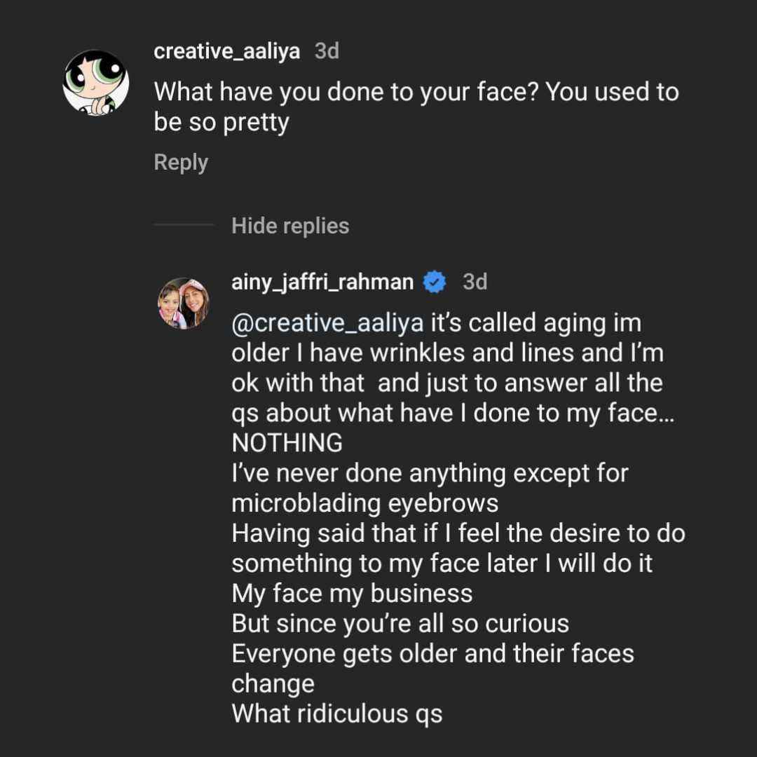 Ainy responded gracefully, educating the user about the natural process of ageing and accepting wrinkles as part of growing older. She clarified not having undergone any cosmetic procedures except for microblading her eyebrows and asserted her right to make decisions about her face, including the possibility of cosmetic treatments in the future.