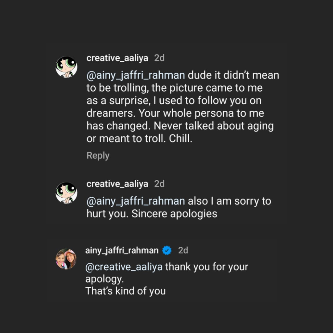 Later, the Instagram user expressed regret, explaining their surprise at the picture and acknowledging that their intention was not to troll or criticize Ainy’s appearance. They offered a sincere apology for any hurt caused.