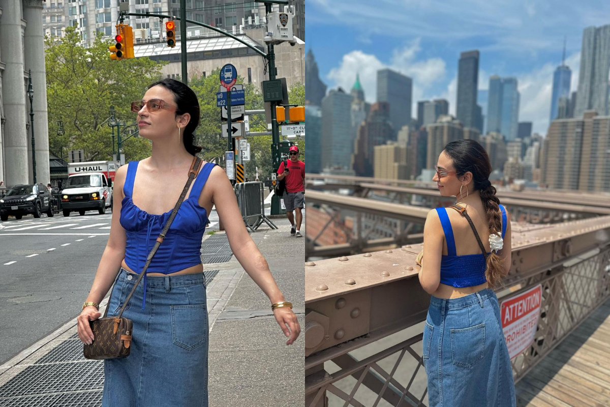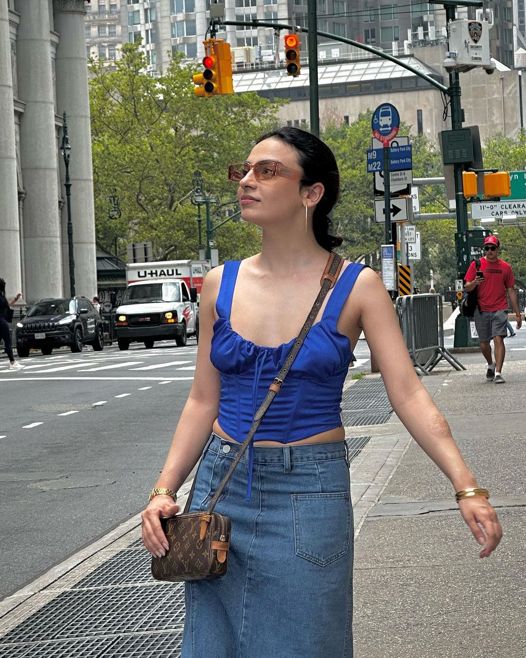 In the photos, she appears incredibly fashionable, pairing her blue top with a jeans skirt and a Louis Vuitton cross-body bag.