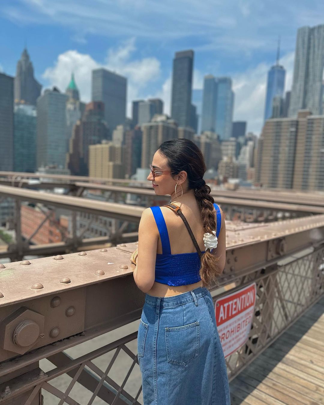 Renowned star Mehar Bano recently delighted her fans with captivating snapshots from her trip to the USA. Looking effortlessly chic and exuding confidence, she rocked a stylish blue crop top with a deep neckline while enjoying the breathtaking view from the Brooklyn Bridge. Her charm remained intact, even with her busy and tired feet.