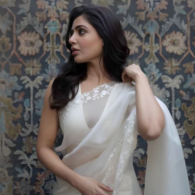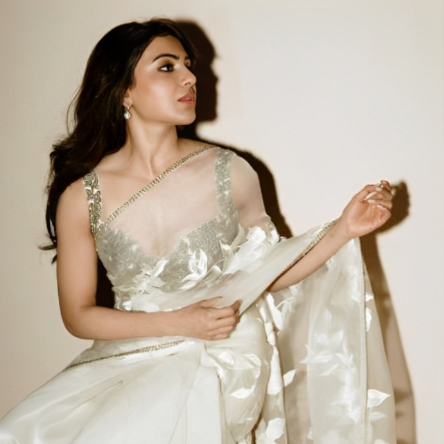 As the enchanting muse of the fashion house Aikeyah, Samantha transformed into a whimsical fashion fairy. She donned a white organza saree adorned with delicate embroidery and paired it with a sleeveless blouse featuring vibrant ochre embroidery. The ethereal ensemble, coupled with minimal white earrings, accentuated her flowing wavy curls and radiant makeup, expertly done by Avni Rambhia.
