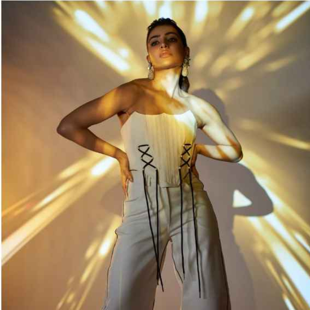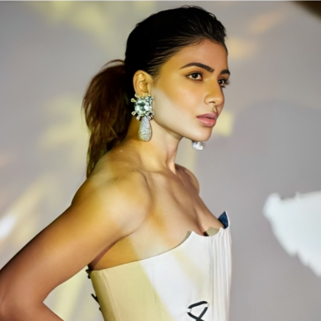 Bringing the heat, Samantha stunned in a white tube corset top and pants outfit. The denim bustier corset top with a contrast black drawstring detail exuded contemporary flair. Paired with relaxed-fit low-rise pants, the ensemble showcased deconstructed seams and contrast paneling. A high ponytail and stunning drop earrings completed the stylish ensemble, while Samantha’s neutral makeup accentuated her natural beauty.