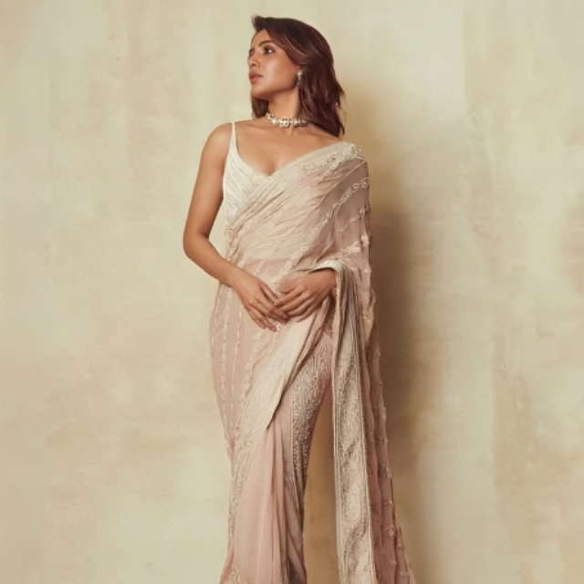 Embracing the epitome of elegance, Samantha donned a stunning beige sari with jharokha intense shadow work. Styled by Preetham Jukaler, her neutral makeup perfectly complemented the timeless charm of the saari. Adorned with a dazzling choker necklace and elegant studs, Samantha radiated grace and sophistication.