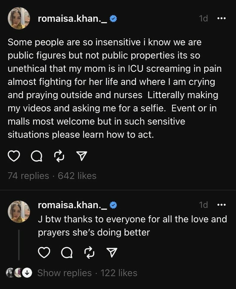 In the emotional post, Khan disclosed that her mother was in the Intensive Care Unit (ICU), fighting for her life and in immense pain. While outside the ICU, praying and crying for her mother’s well-being, she faced an unsettling and unethical situation. Instead of receiving support, some hospital staff treated her as if she were public property, invading her privacy and disregarding her emotional state.