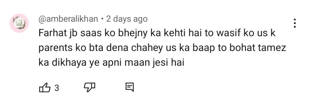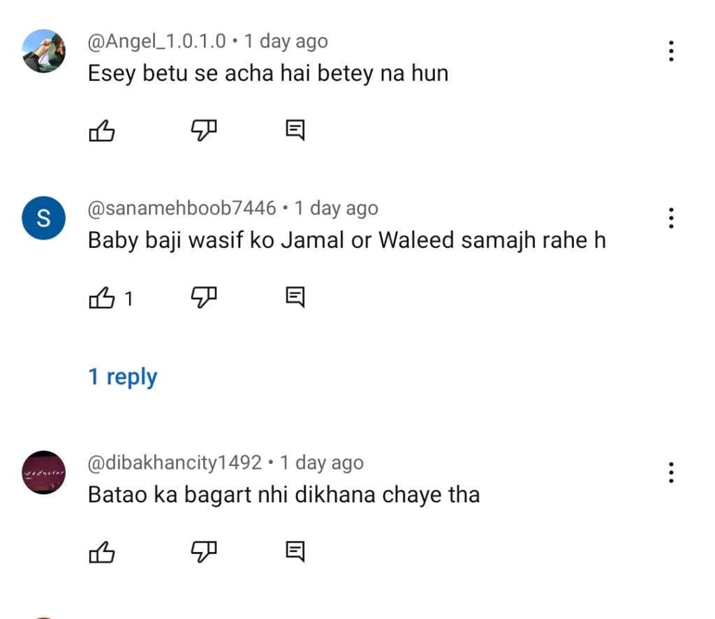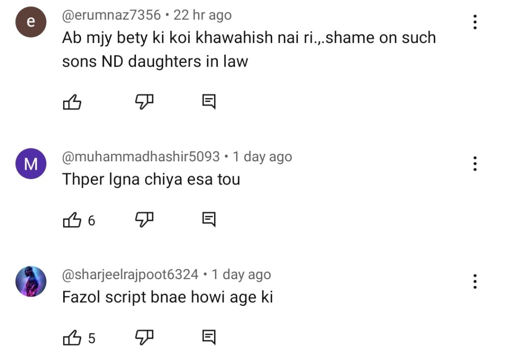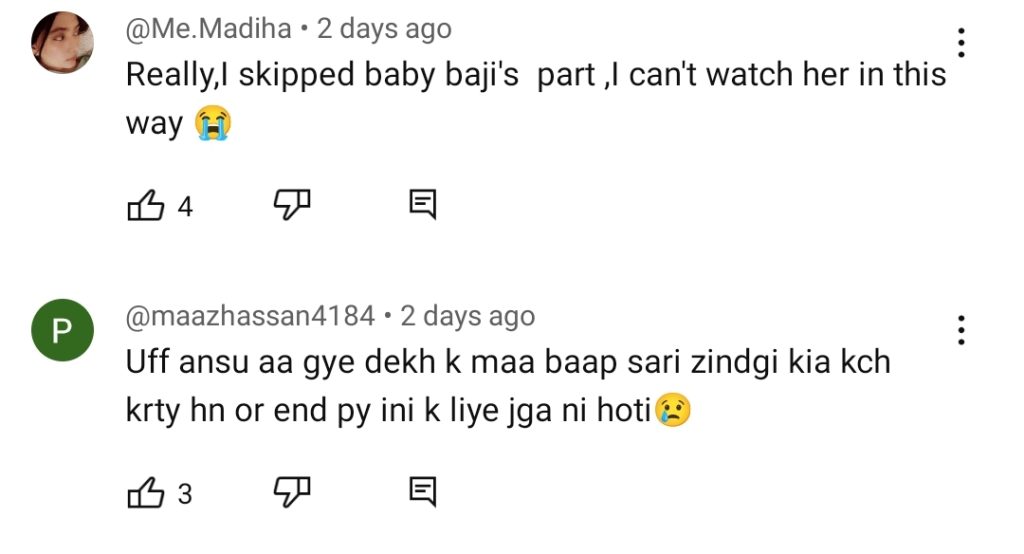 Viewers empathize with the reality depicted in the drama, witnessing the sufferings of mothers in similar situations in real life. However, some express concern that such heart-wrenching dramas may send the wrong message and find them painful to watch. Social media users share similar sentiments, highlighting the contrast between how sons and daughters treat their parents after marriage. Some even express frustration towards the characters of the sons in the drama, who fail to keep their mother with them. As a result, many viewers skip Baby Baji’s scenes to avoid witnessing her painful moments. Check out the comments below: