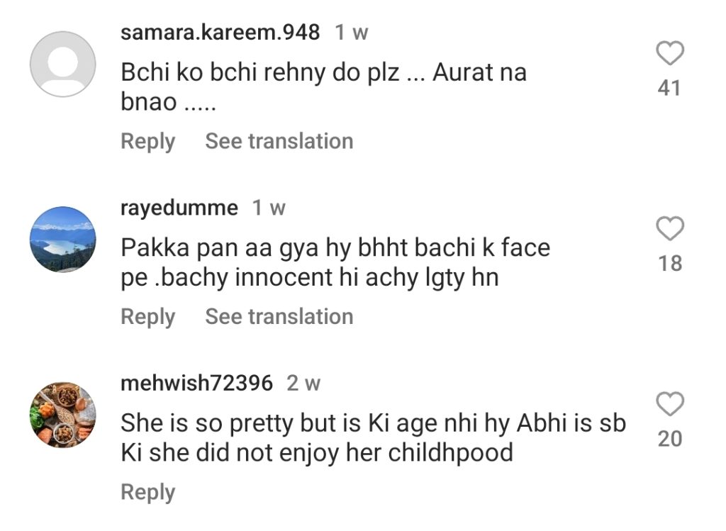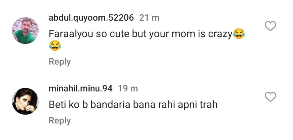 Fiza Ali’s recent Instagram reels featuring her daughter Faraal faced substantial backlash. Individuals on social media began to question her parenting choices. Many believe that Faraal, being innocent, should be shielded from the world of acting and social media. Critics argue that Fiza Ali should allow her daughter to enjoy her childhood without unnecessary exposure. Moreover, some individuals expressed disapproval of Fiza Ali’s exaggerated performance in the reel set to the song “Dunia Haseenon Ka Maila.” The comments on the post reflected these sentiments: