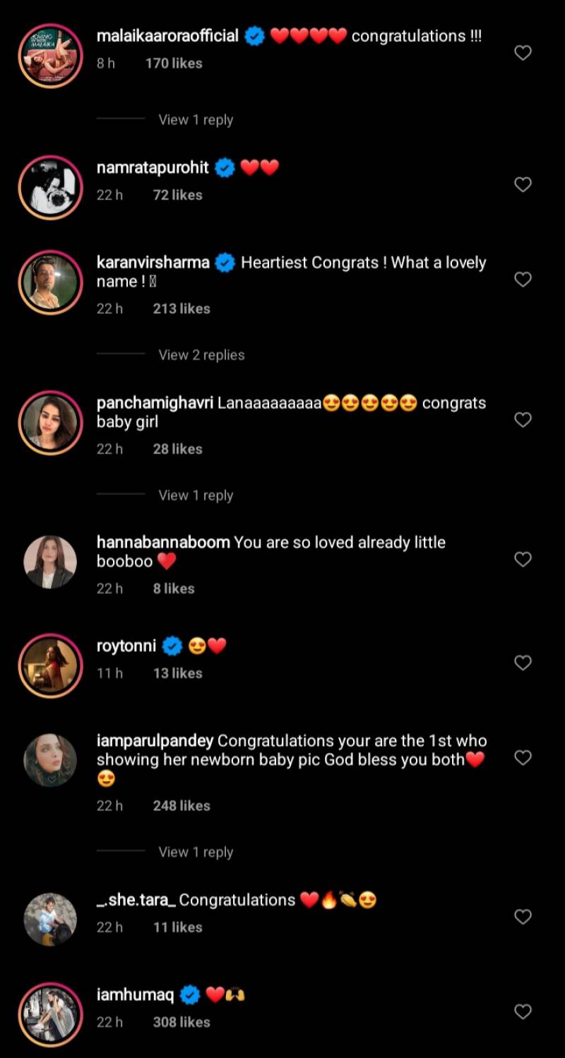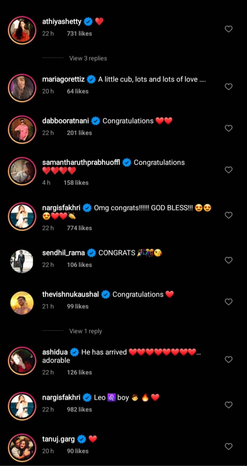 Bollywood celebrities such as Huma Qureshi, Athiya Shetty, Samantha Ruth Prabhu, Nargis Fakhri, and Malaika Arora, along with other internet users, extended their congratulations to the new mother.