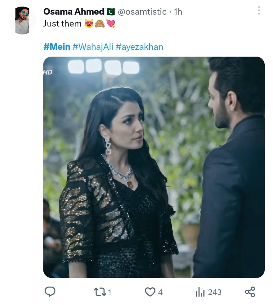 Yesterday, marked the much-anticipated premiere of the first episode of “Mein,” starring Wahaj Ali and Ayeza Khan. The drama’s narrative revolves around Mubashira, a character-driven by ego, who seeks control over everything. Audiences witnessed the debut episode of the drama series “Mein,” enjoying the initial instalment. Ayeza Khan’s impactful entry as Mubashira earned praise from viewers who commended her precise styling and demeanour. Wahaj Ali’s impressive presence as Zaid on screen was also well-received. Fans are drawn to the drama’s unique storyline, which unfolds the journeys of Mubashira and Zaid. While a few viewers noted minor technical issues related to audio and visuals, the overall reception of the drama was positive. Some fans even drew parallels between Ayeza Khan’s portrayal and her character Mehwish from “Mere Paas Tum Ho.”