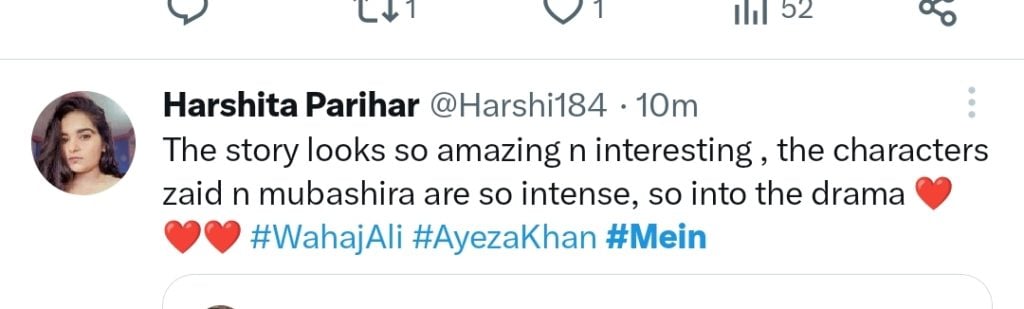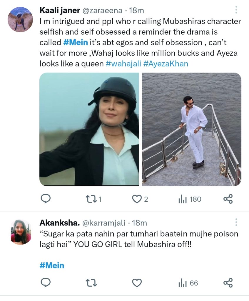 Yesterday, marked the much-anticipated premiere of the first episode of “Mein,” starring Wahaj Ali and Ayeza Khan. The drama’s narrative revolves around Mubashira, a character-driven by ego, who seeks control over everything. Audiences witnessed the debut episode of the drama series “Mein,” enjoying the initial instalment. Ayeza Khan’s impactful entry as Mubashira earned praise from viewers who commended her precise styling and demeanour. Wahaj Ali’s impressive presence as Zaid on screen was also well-received. Fans are drawn to the drama’s unique storyline, which unfolds the journeys of Mubashira and Zaid. While a few viewers noted minor technical issues related to audio and visuals, the overall reception of the drama was positive. Some fans even drew parallels between Ayeza Khan’s portrayal and her character Mehwish from “Mere Paas Tum Ho.”