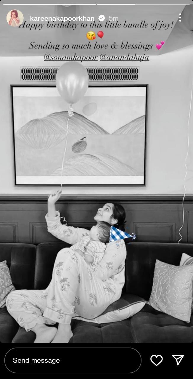 She posted the lovely picture and penned down the words, “Happy birthday to this little bundle of joy! Sending so much love and blessings. @sonamkapoor @anandahuja,” In addition to using kissing, balloon, and two hearts emojis, Sonam also shared Kareena’s post on her own story.