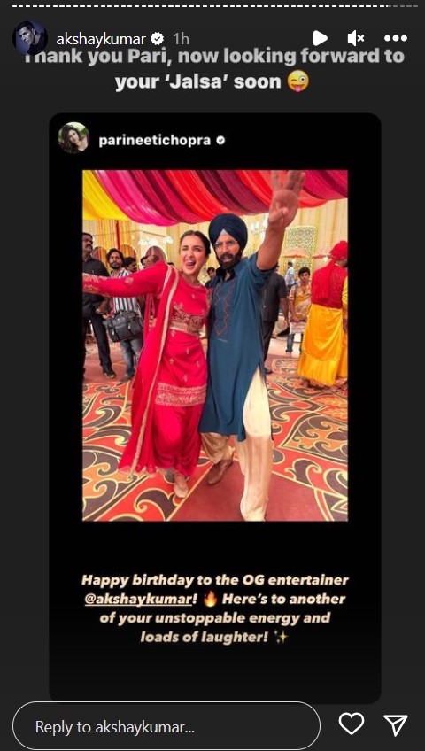 In response to these well-wishes, Akshay expressed his gratitude to Parineeti and eagerly anticipated her upcoming “Jalsa,” using a playful emoji to convey his excitement. He remarked, “Thank you, Pari, now looking forward to your ‘Jalsa’ soon (winking face with tongue emoji).” You can see it here.