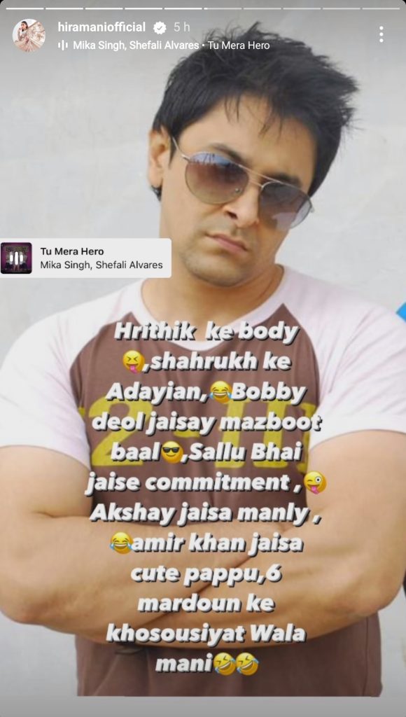In her playful comparison, Hira noted, “Mani possesses Hrithik’s physique, Shahrukh’s charm, Bobby Deol’s strong hair, Salman Khan’s unwavering commitment, Akshay Kumar’s masculinity, and Aamir Khan’s adorable innocence – he’s a blend of the distinctive qualities of these six men.” She even set the mood by playing Mika Singh’s famous song “Tu Mera Hero” in the background. Here’s a glimpse of her post: