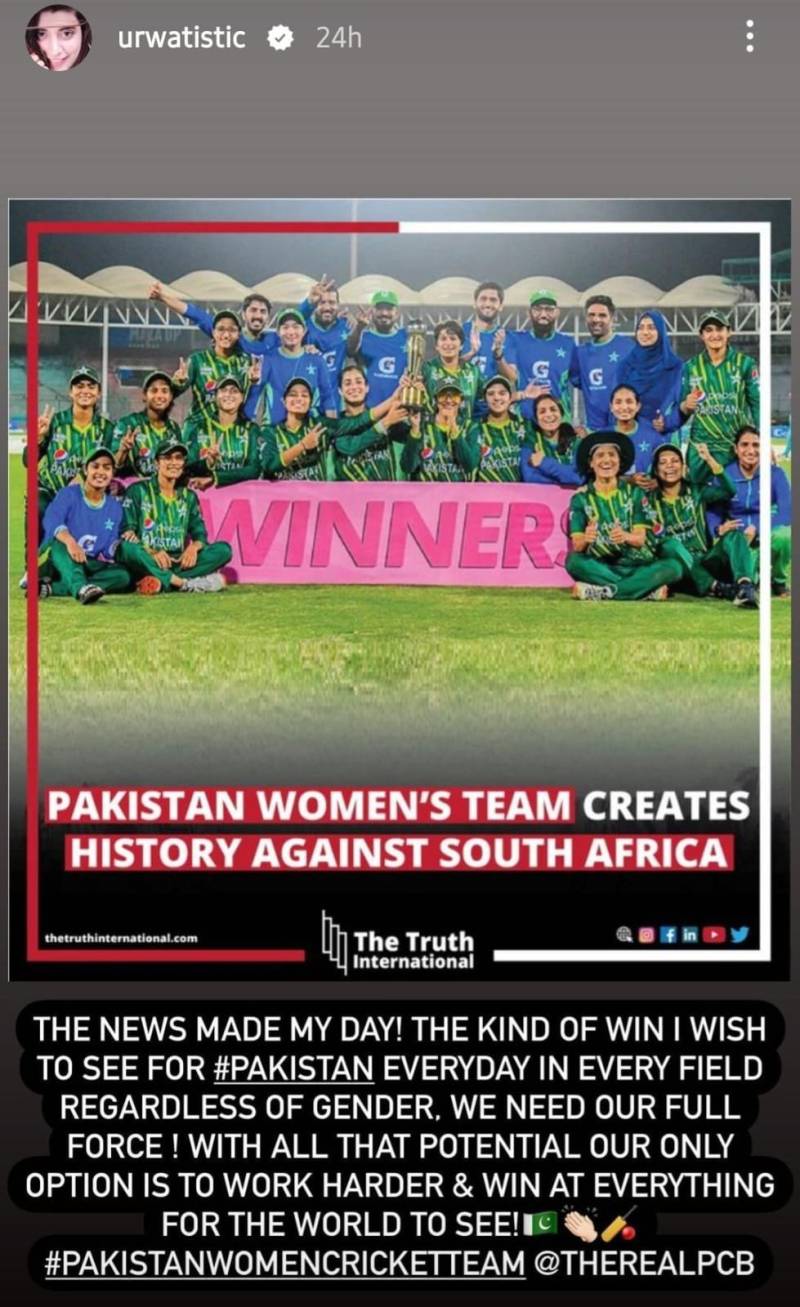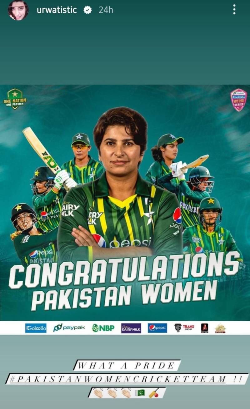 Renowned actor Mawra Hocane shared her joy on her Instagram Story, offering her heartfelt congratulations to Sidra Amin and the entire women’s cricket team. Her sentiments mirrored the collective happiness felt by many who were deeply moved by the team’s exceptional performance. Another prominent figure, Urwa Hocane, expressed her excitement on a popular social media platform, noting that this news had brought brightness to her day. She expressed a strong desire for such victories for Pakistan in all fields, regardless of gender, and emphasized the importance of the nation coming together. On her Instagram Story, she proudly declared that this triumph was a source of immense “pride” for the entire nation.
