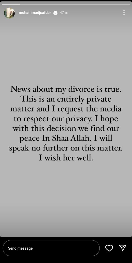 Junaid Safdar, Maryam Nawaz’s son and Nawaz Sharif’s grandson, recently announced his divorce. Junaid announced the news on his official Instagram account. On his official Instagram, he posted, “News about my divorce is true. This is an entirely private matter and I request the media to respect our privacy. I hope with this decision we find our peace In Shaa Allah. I will speak no further on this matter. I wish her well.”
